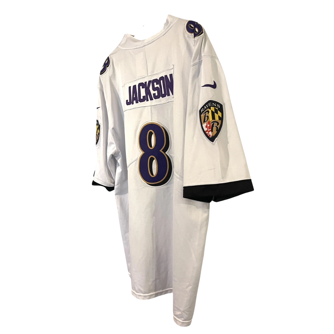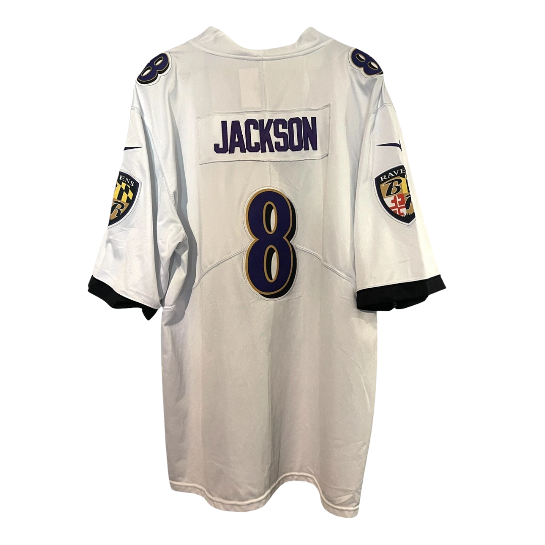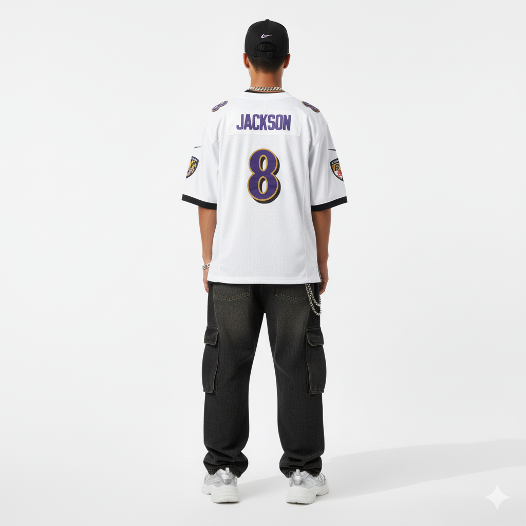 ✅ Player Name & Number – LAMAR JACKSON #8 stitched details.