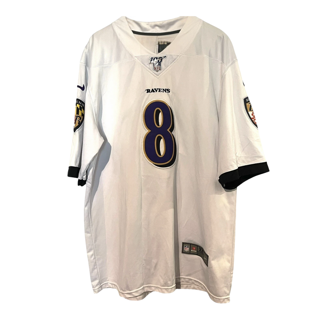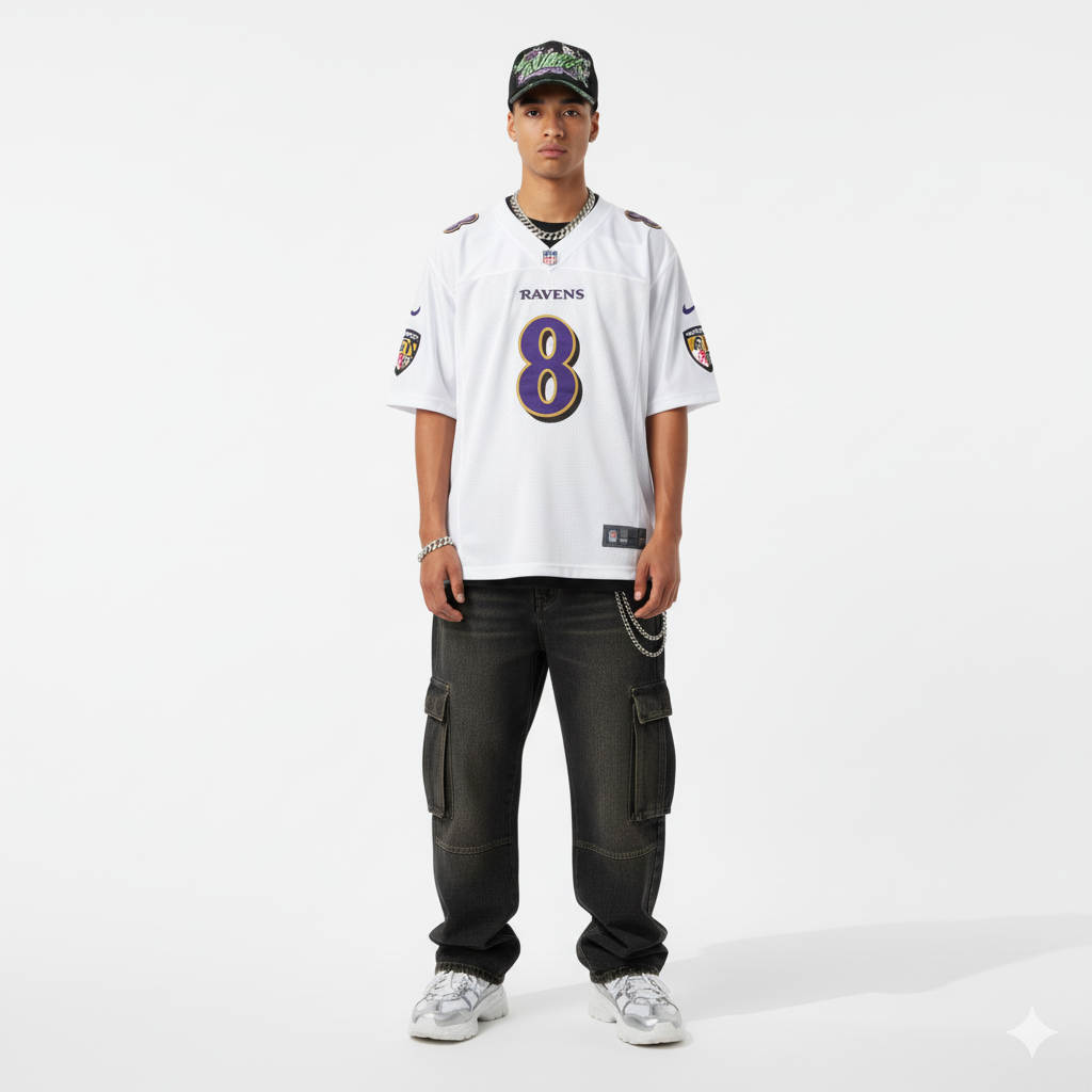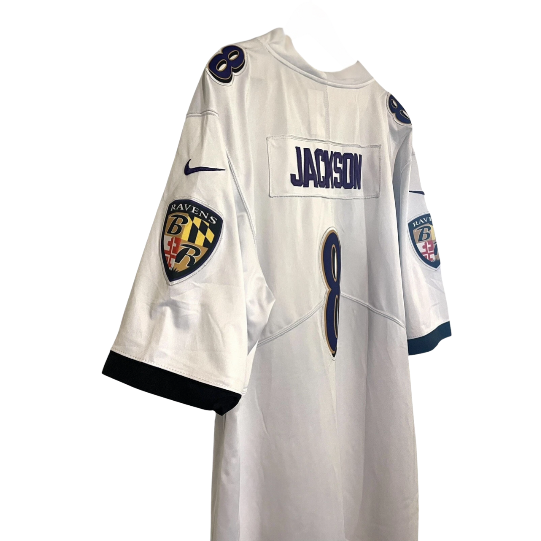 ✅ Player Name & Number – LAMAR JACKSON #8 stitched details.